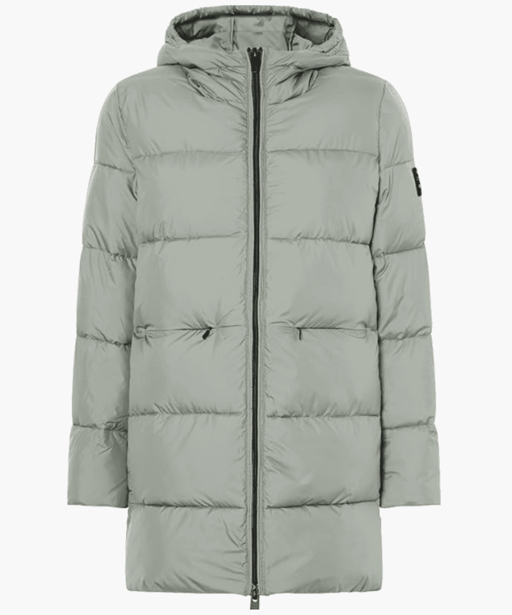 El diseño del Abrigo Marangu Ecoalf se caracteriza por su silhouette acolchada de líneas horizontales, un corte recto y largo que cubre hasta la parte superior del muslo, y una capucha integrada que refuerza su funcionalidad. Su cierre frontal de cremallera bidireccional permite un ajuste cómodo y versátil, mientras que los bolsillos laterales ocultos ofrecen practicidad sin romper la estética minimalista del diseño. El color —un tono verde grisáceo suave— aporta un aire contemporáneo, sobrio y elegante, fácil de combinar con cualquier look urbano o casual.
