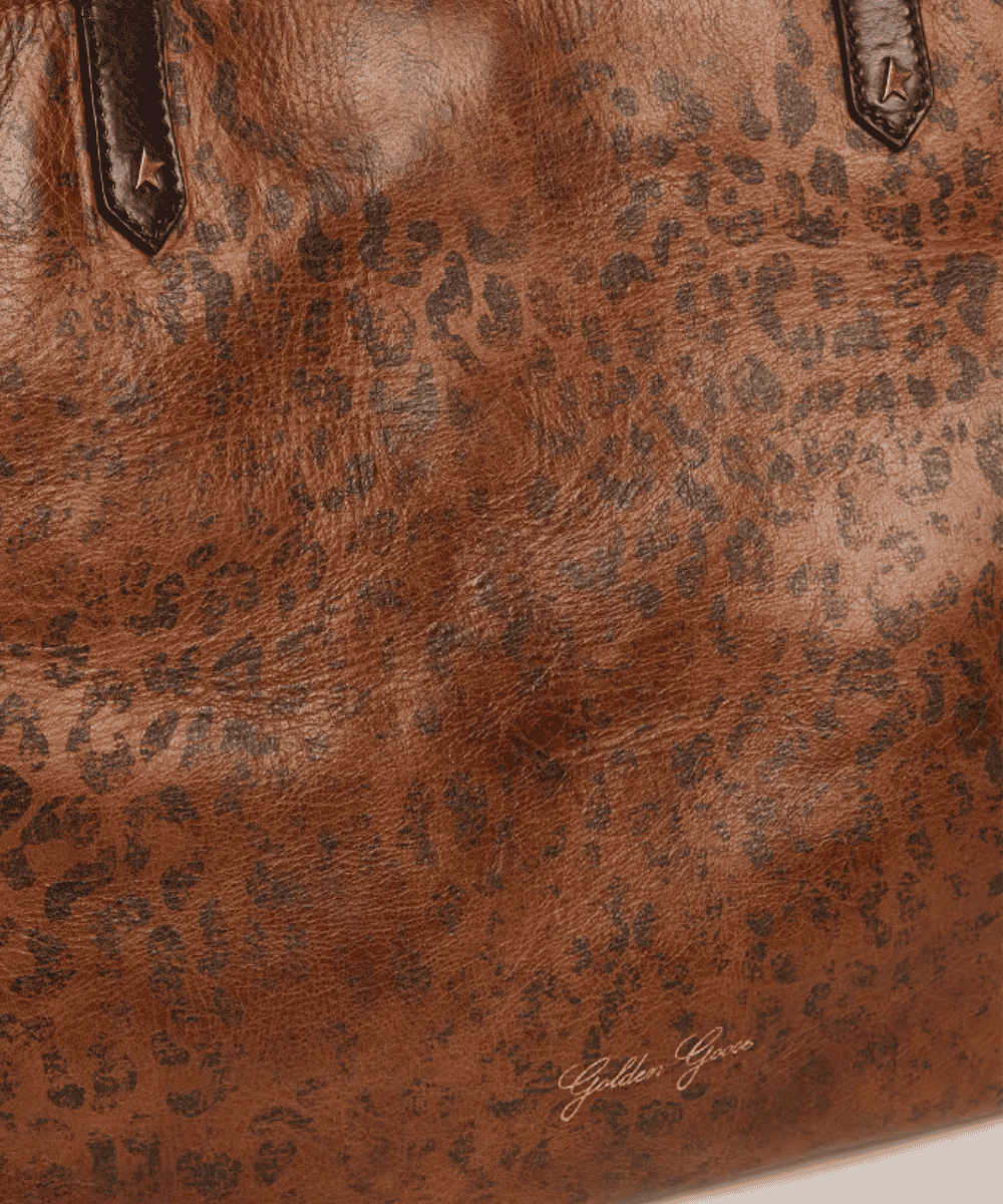 Cada Bolso Pasadena de piel martillada Golden Goose es diferente, ya que el curtido vegetal garantiza que la textura y el tono de cada pieza sean irrepetibles. Esto lo convierte en un accesorio exclusivo que refleja la personalidad de quien lo lleva. Su diseño destaca por la piel martillada con estampado de leopardo, un detalle sofisticado y moderno que aporta fuerza y carácter. Además, las asas dobles en piel negra crean un contraste elegante, realzadas por las tachuelas doradas en forma de estrella, un símbolo icónico de Golden Goose.