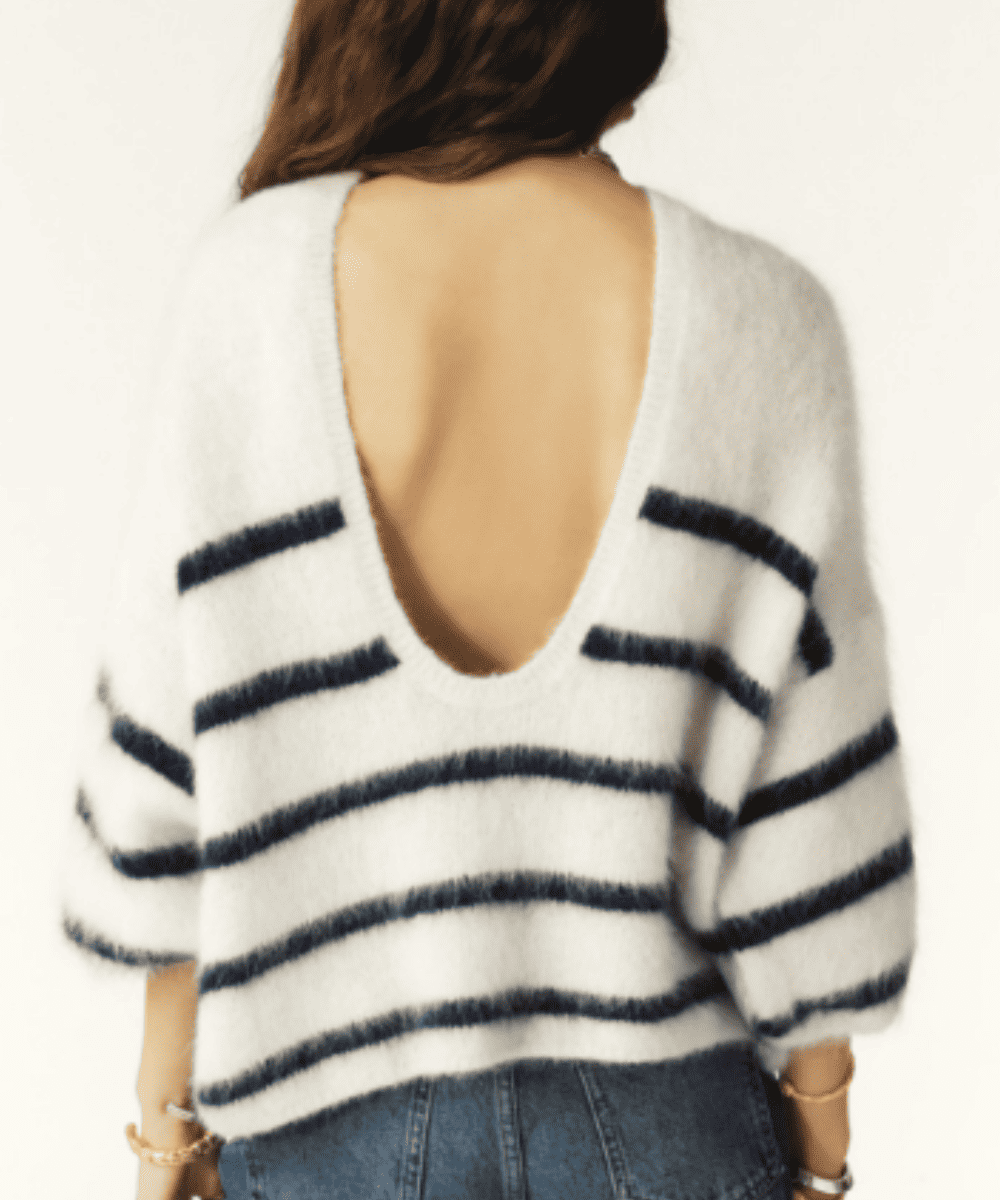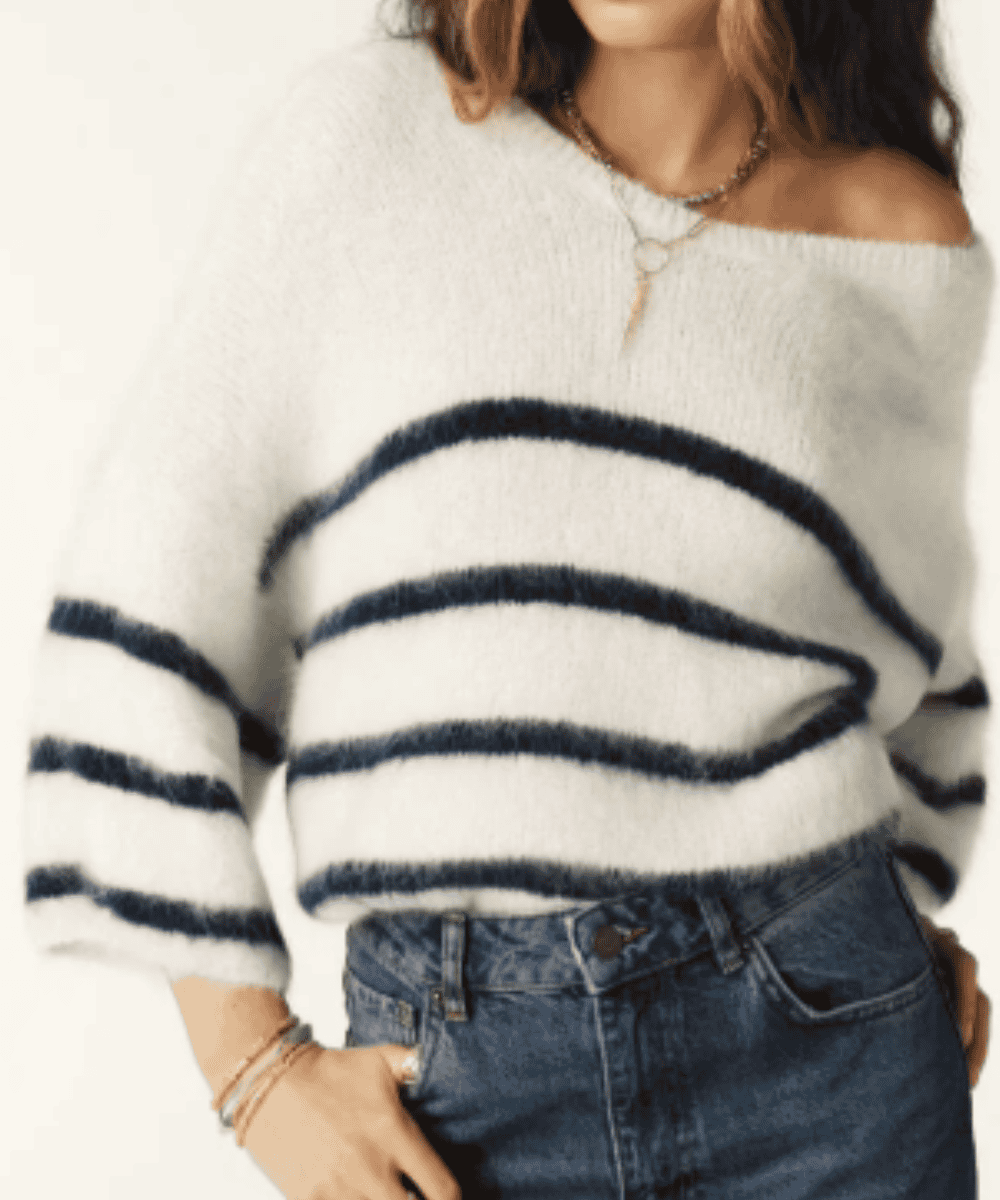 El icónico patrón de rayas marineras (Breton stripes) en tonos azul marino sobre el fondo crudo es el corazón del Jersey Biguel Ecru Bash. Estas rayas horizontales, perfectamente espaciadas, son un símbolo de la moda francesa clásica. Sin embargo, en el contexto de la textura esponjosa y el corte oversize de ba&sh, este motivo adquiere una nueva dimensión, volviéndose más suave, romántico y menos estructurado que el tradicional. Esta reinterpretación hace que el Jersey Biguel Ecru Bash sea una pieza versátil y atemporal, que trasciende las modas pasajeras.